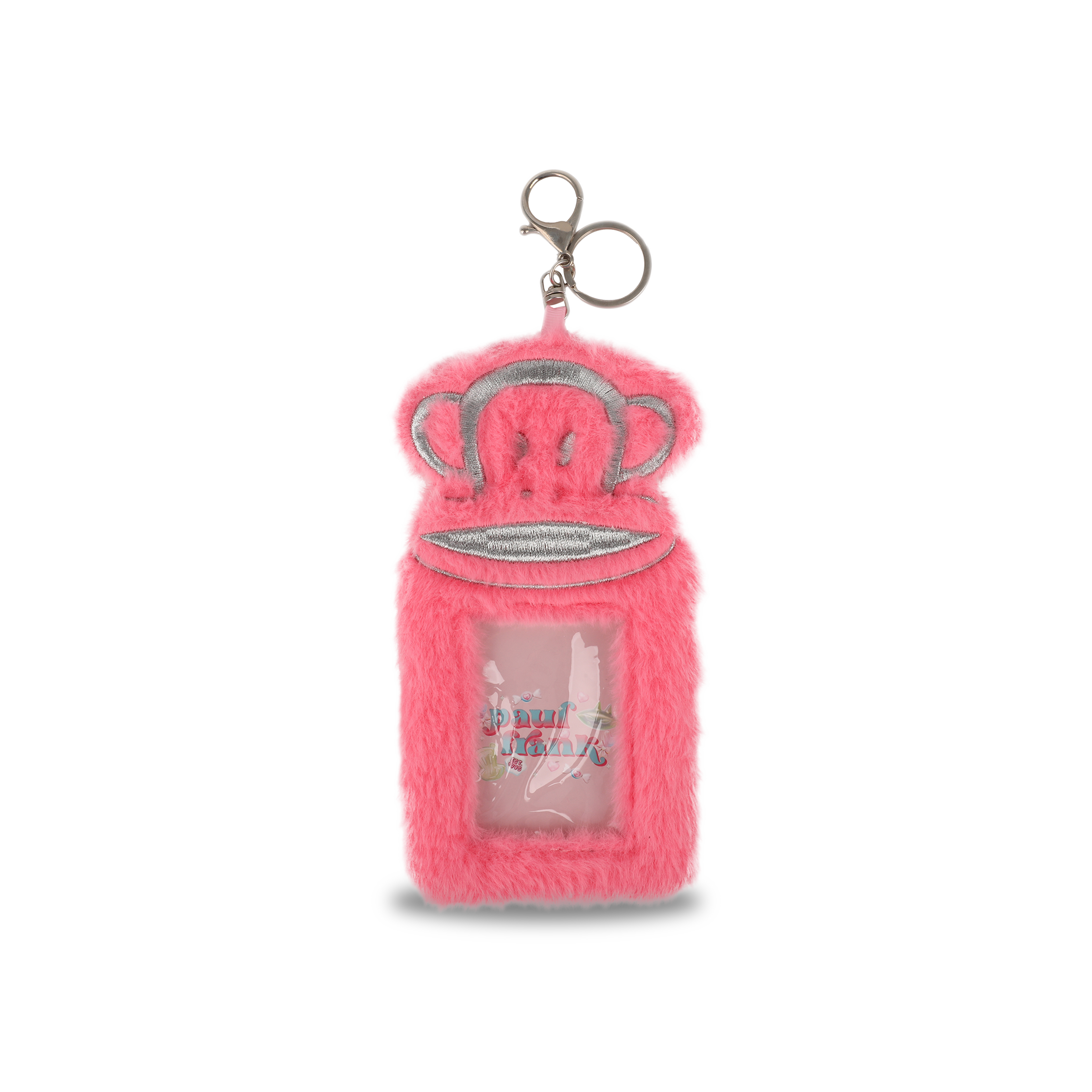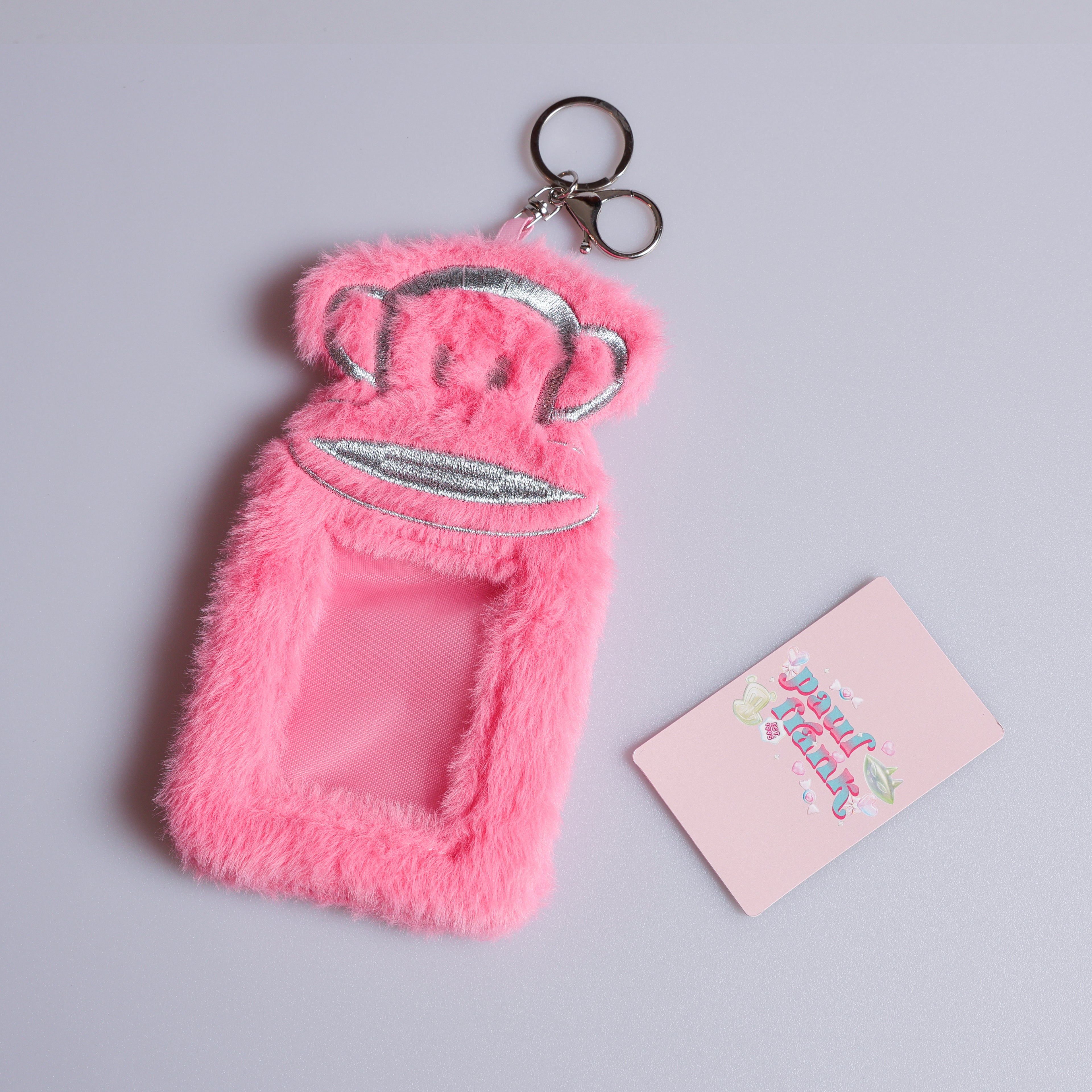 This playful plush card holder features a charming pink monkey design made from soft fabric with silver thread embroidery for a sparkling touch. Measuring 100x185mm, it’s perfect for keeping your cards safe and accessible. A silver lobster clasp attached with a pink satin ribbon lets you clip it onto bags or keys for easy carrying and a fun pop of personality.